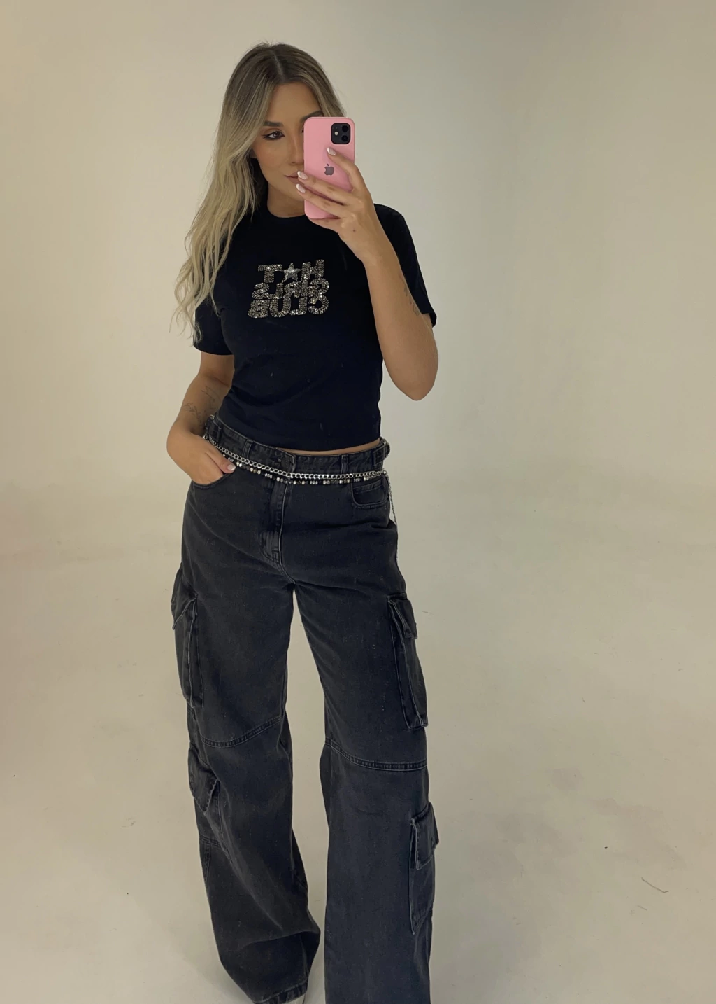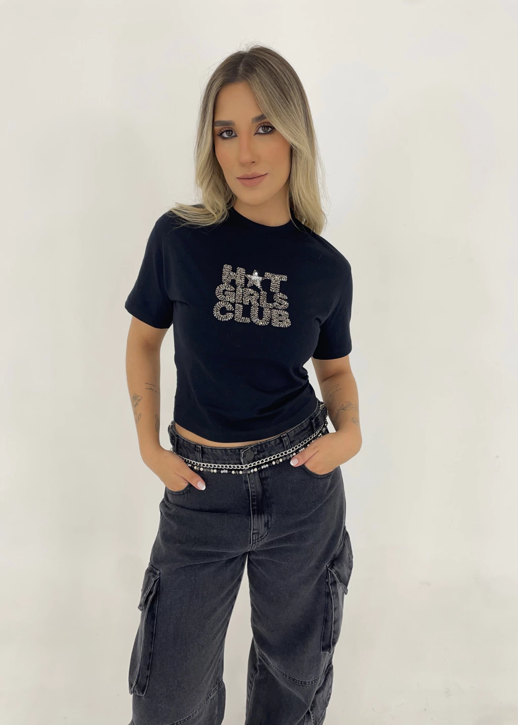 A peça possui a frase "hot girls club" bordada à mão na parte da frente com mix de vidrilhos em fumê e paetê em prata.