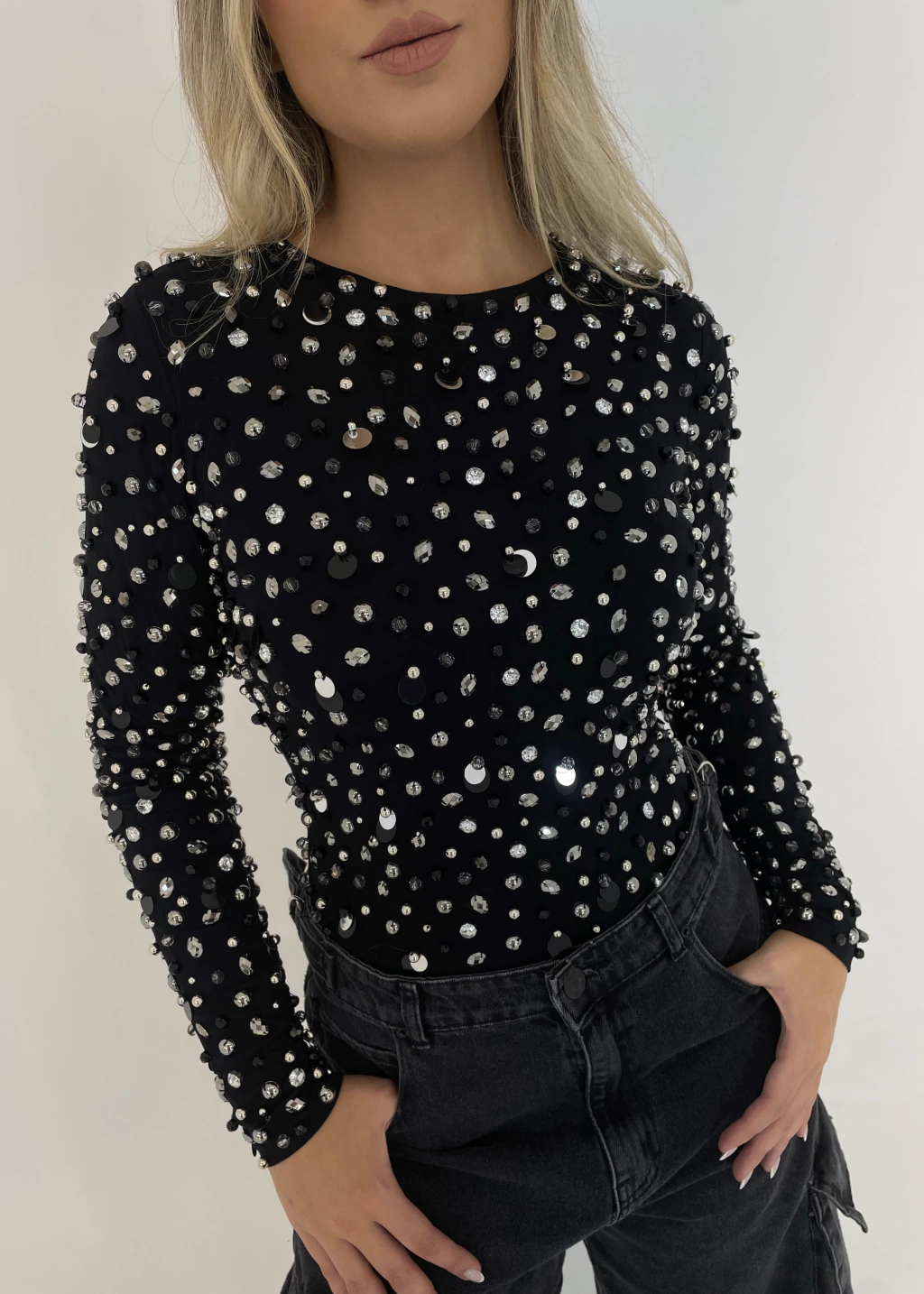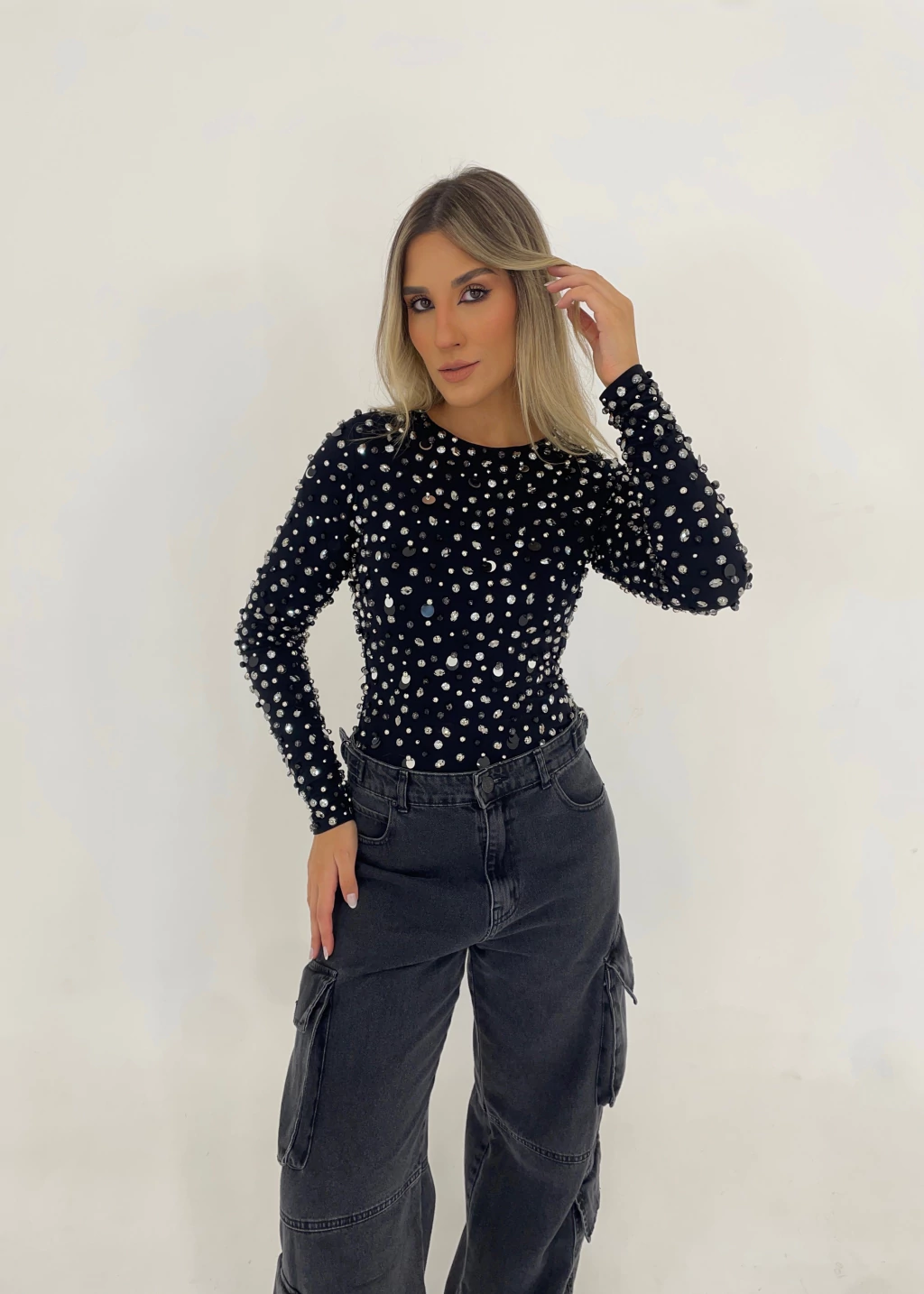 Peça toda bordada à mão com mix de pedrarias, cristais e paetês em tons de prata, preto e fumê (na parte da frente, costas e mangas).