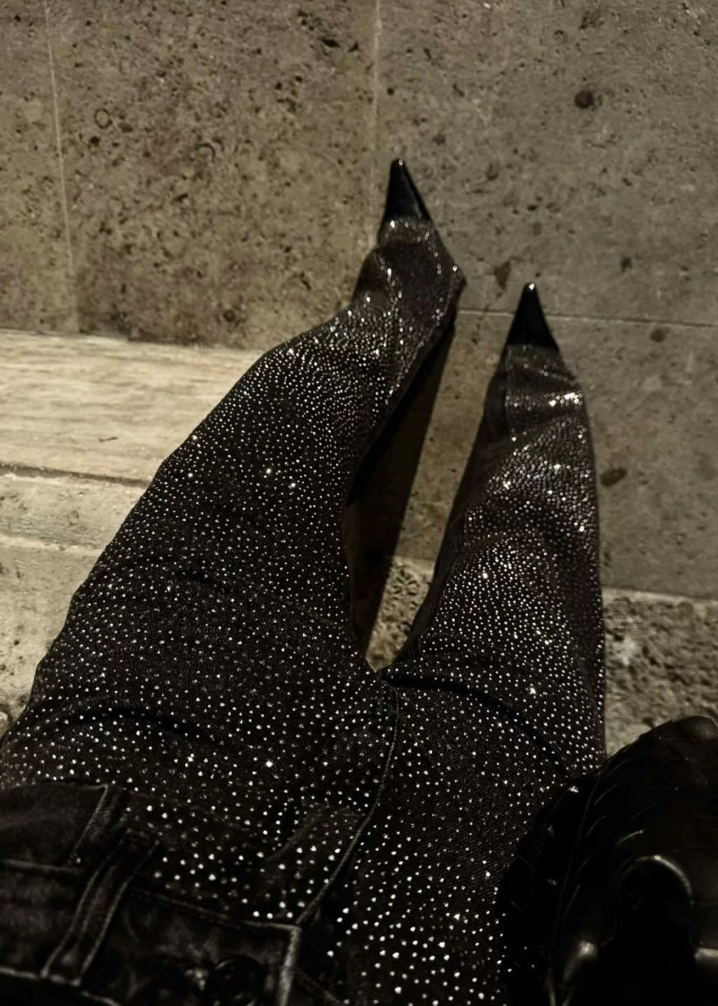 Calça jeans em modelagem reta, com cintura intermediária na atura do umbigo. Possui aplicações de strass/hotfix prateados em toda a parte da frente.