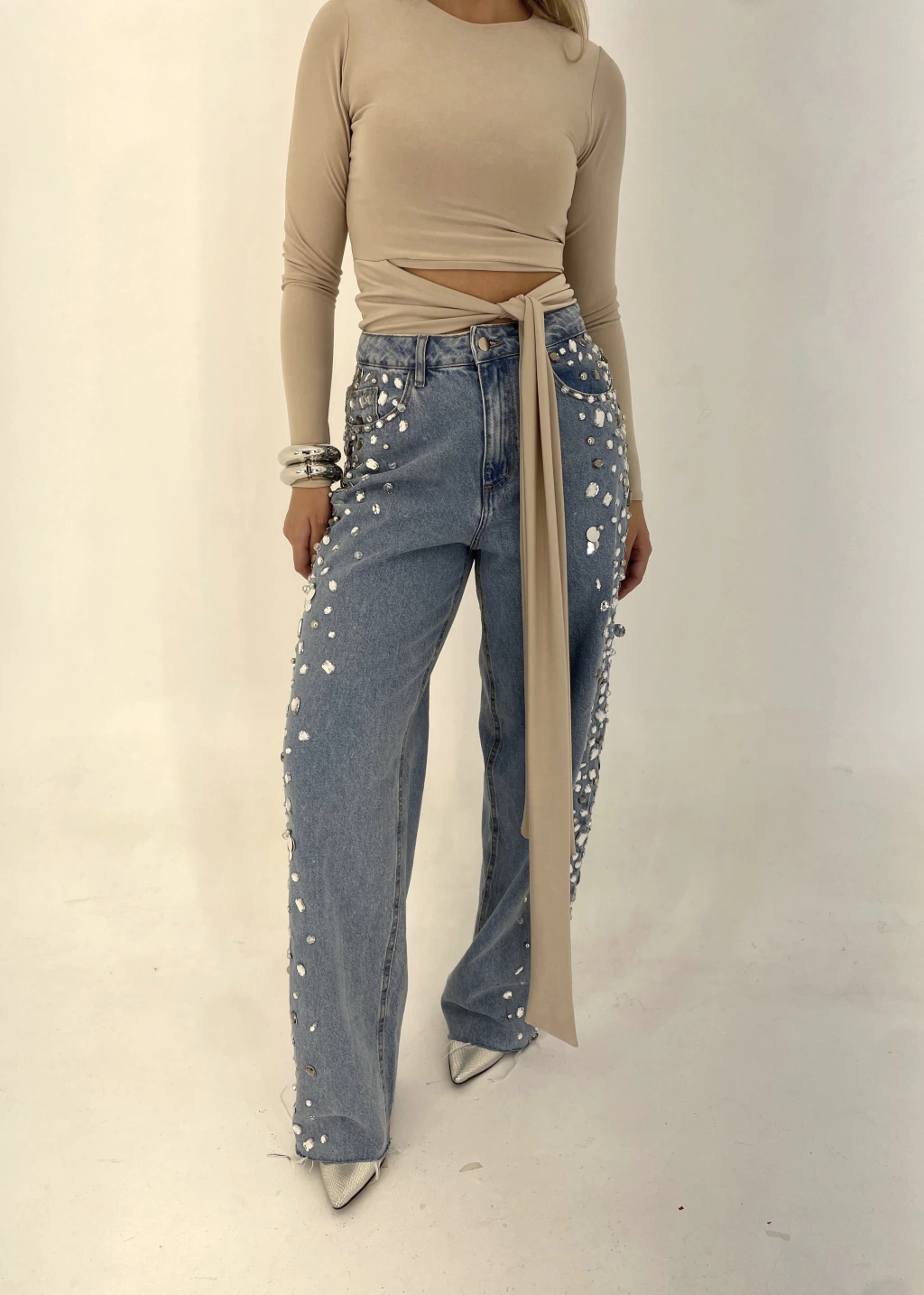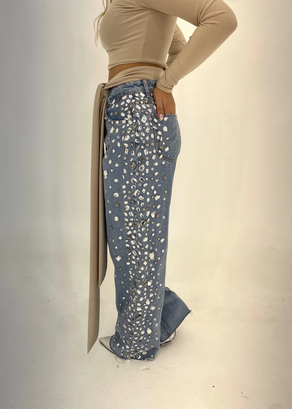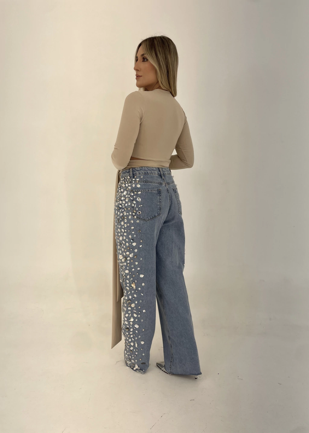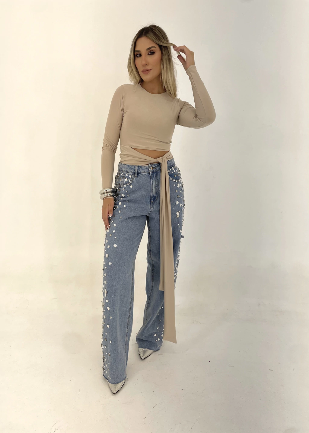 Peça bordada toda à mão na lateral das pernas, com mix de pedrarias e paetês prateados.