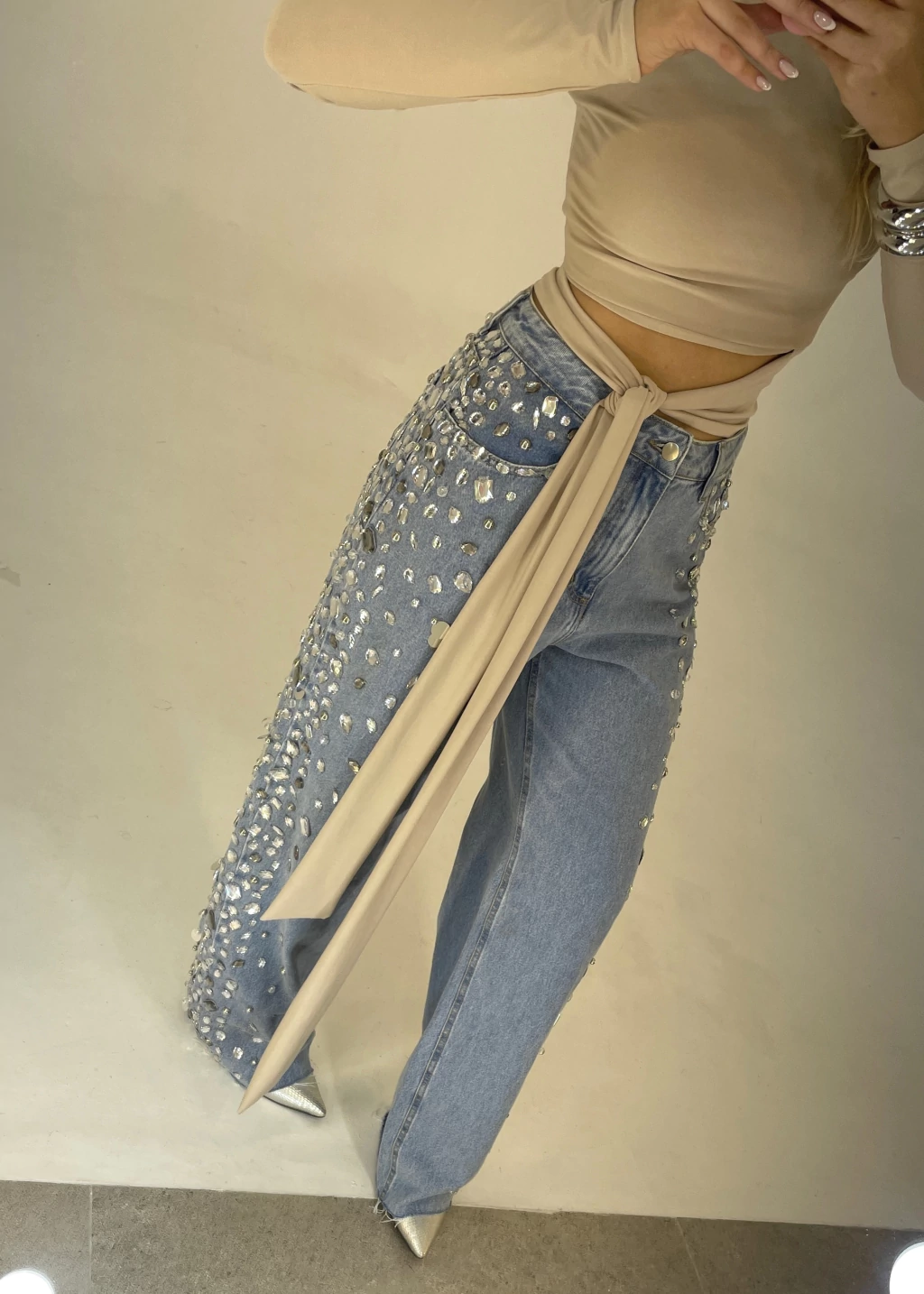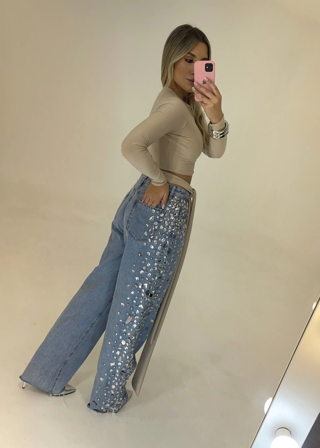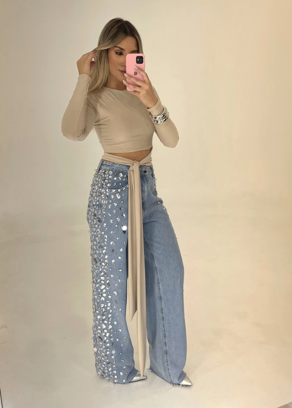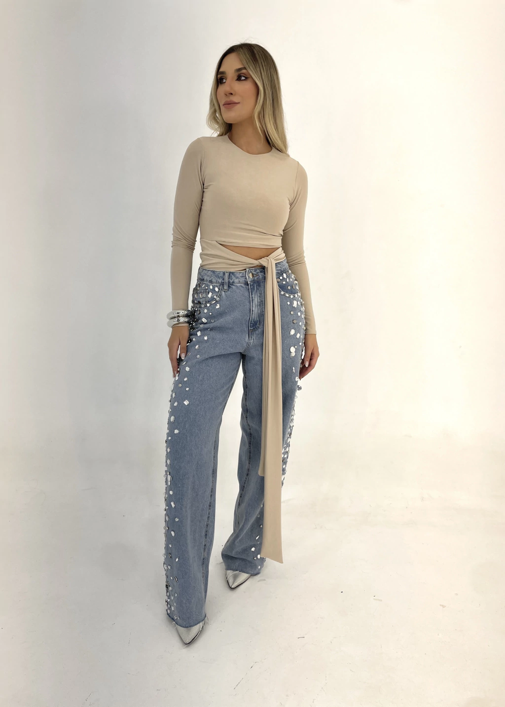 Peça bordada toda à mão na lateral das pernas, com mix de pedrarias e paetês prateados.