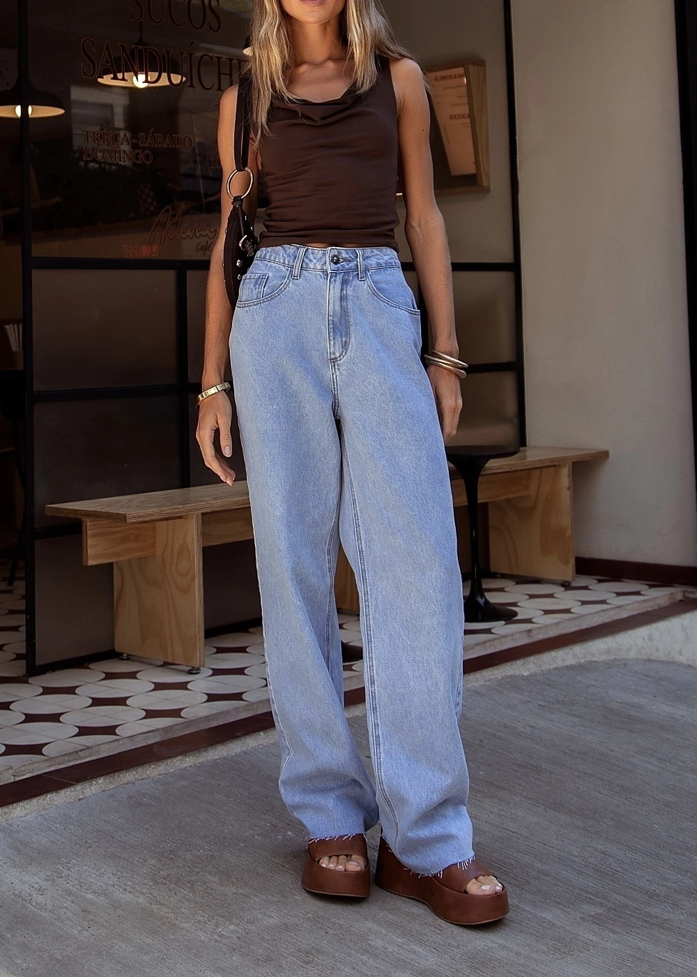 Calça jeans em modelagem wide leg, mais solta no corpo, com cintura cerca de 2 dedos abaixo do umbigo. Possui passantes no cós e bolsos nas costas.
