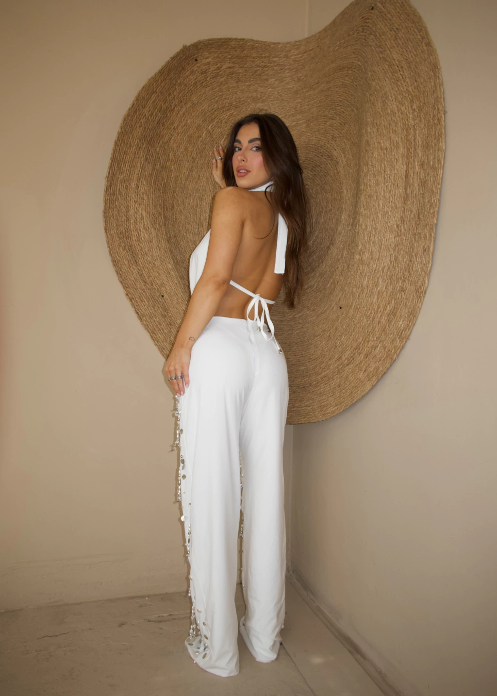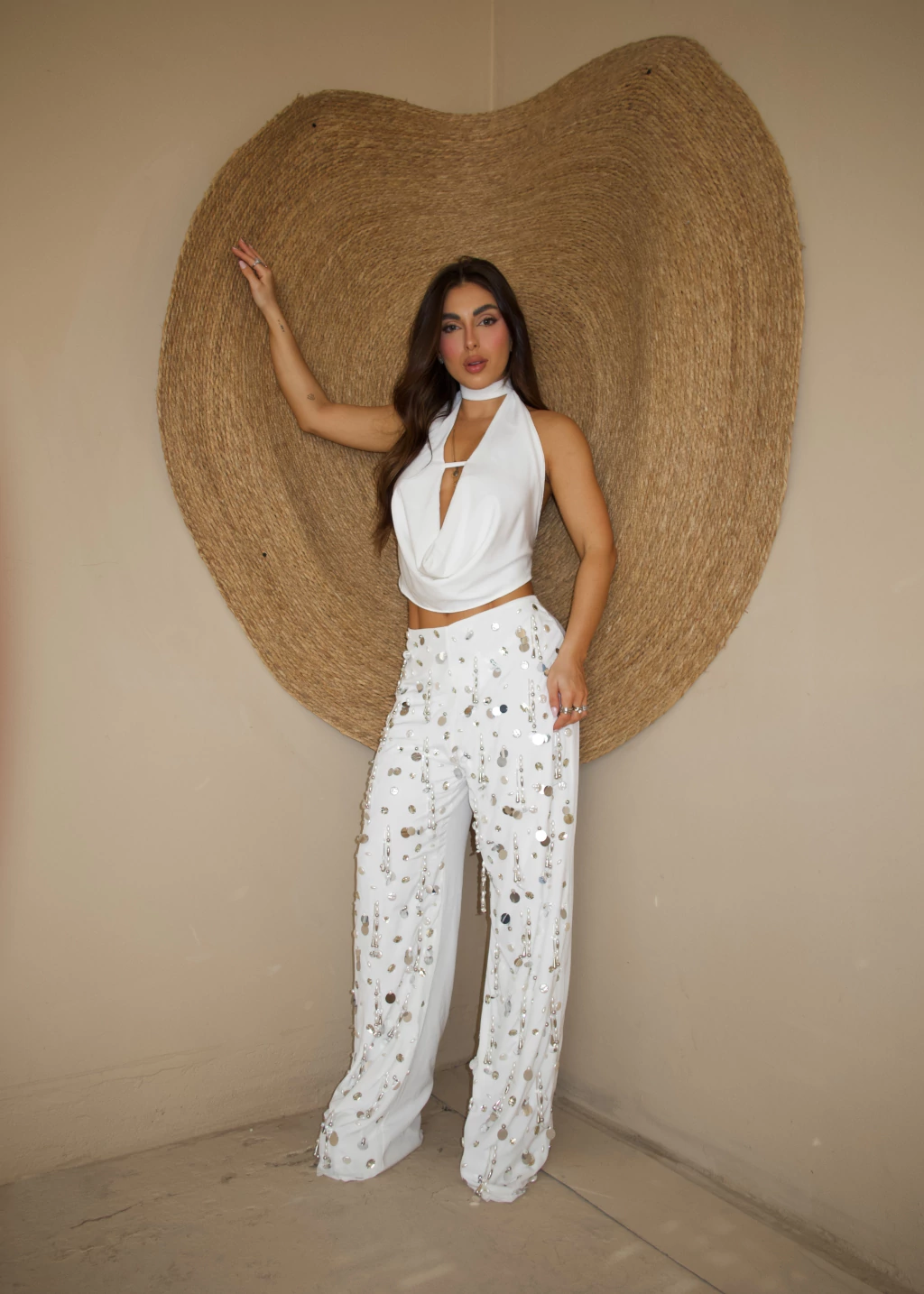 Calça bordada em toda a parte da frente com franjas salpicadas por todo o comprimento e mix de paetês e pedrarias em tons de pérola e prata.