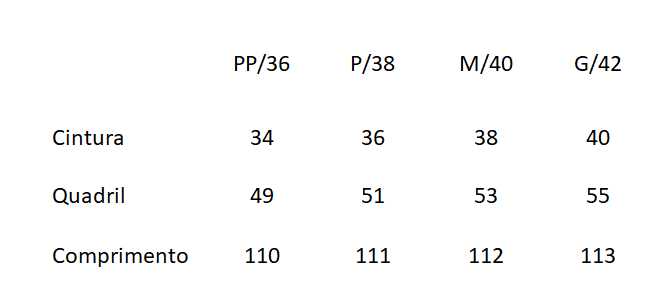 Recomendamos optar pelo seu tamanho habitual de calça jeans para que a peça fique na altura do umbigo e soltinha no corpo. Sugerimos também que você compare a medida de cintura da tabela abaixo com a medida de cintura de alguma calça que você goste, assim a escolha de tamanho fica mais assertiva!