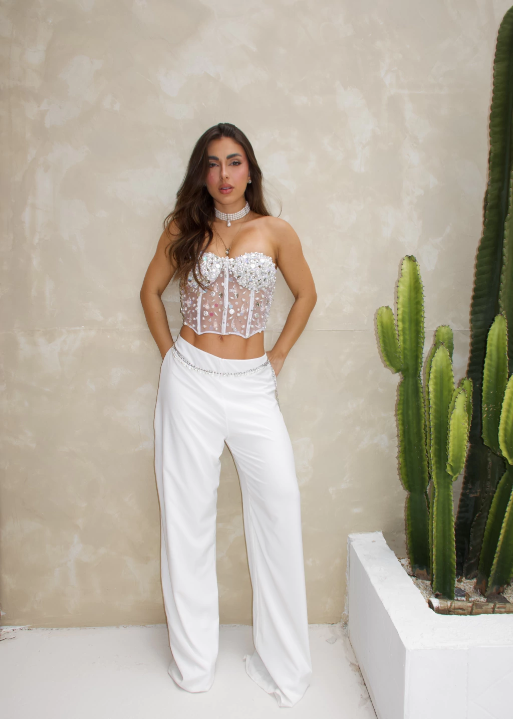 Peça bordada manualmente com mix de pedrarias, miçangas, paetês e cristais em tons de pérola, prata e transparente/furta cor.