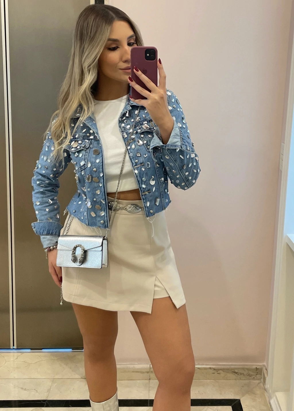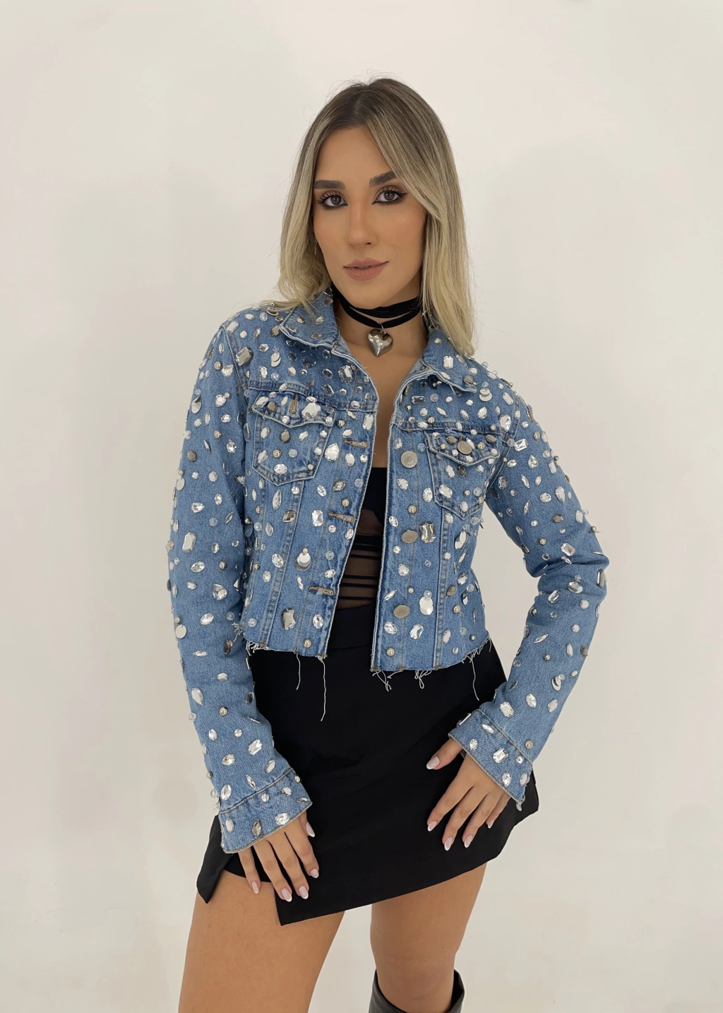 A jaqueta é inteira bordada à mão (frente, costas e mangas) com mix de pedrarias, cristais e paetês em prata.