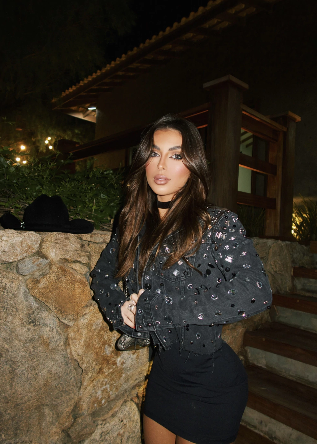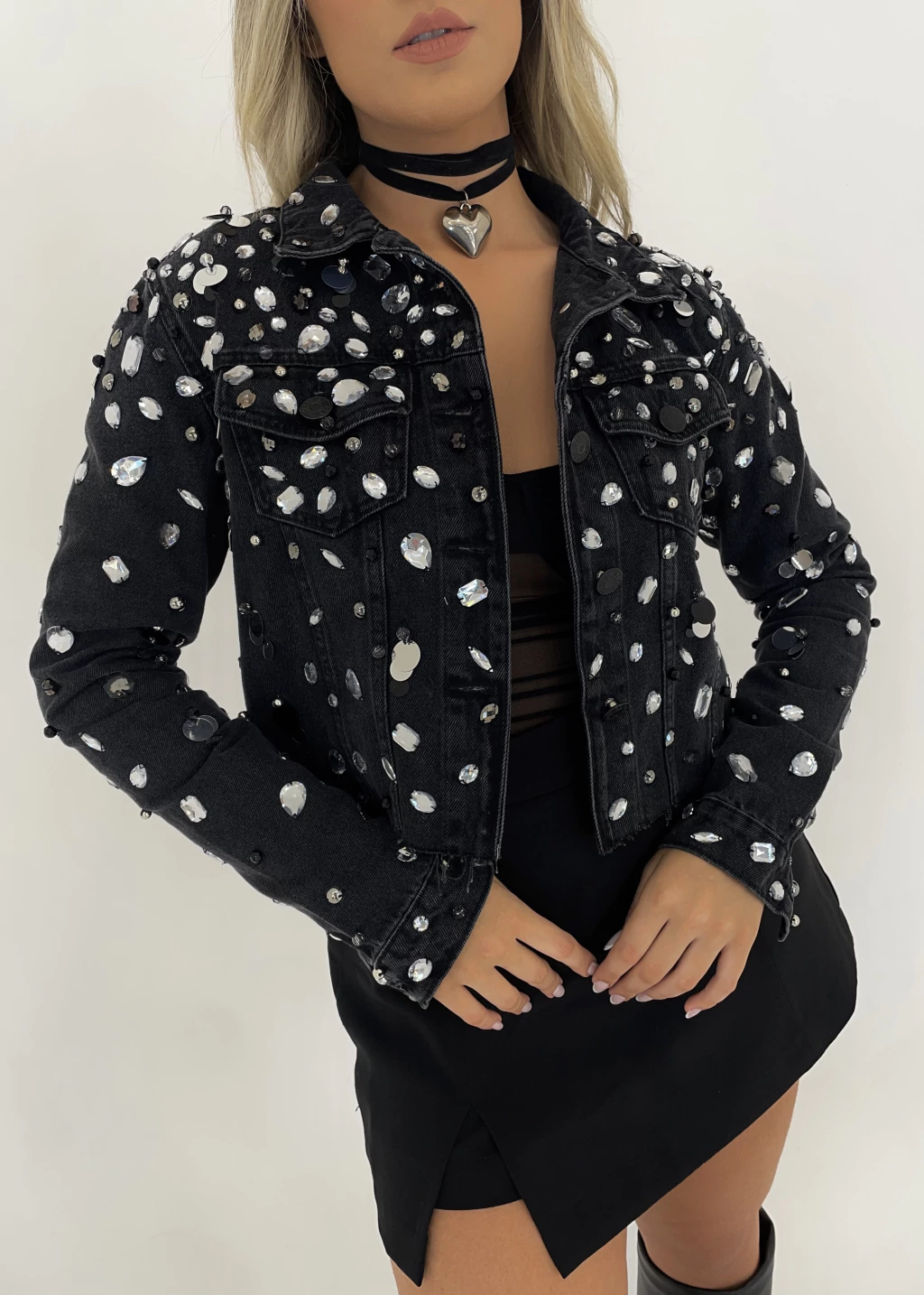 A jaqueta é inteira bordada à mão (frente, costas e mangas) com mix de pedrarias, cristais e paetês em prata/preto/fumê.