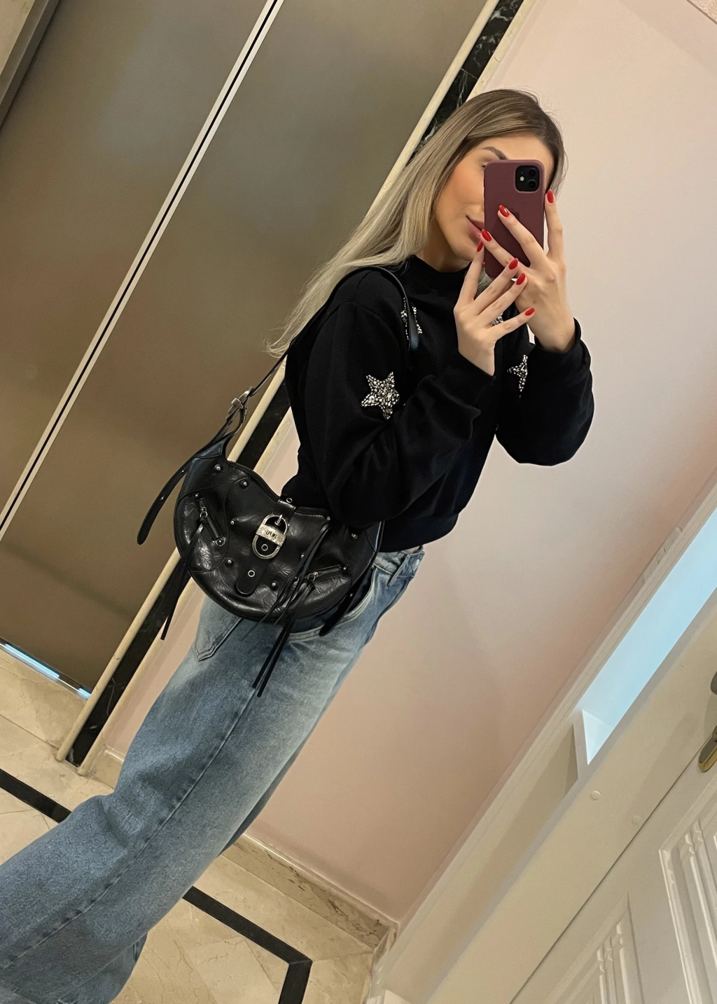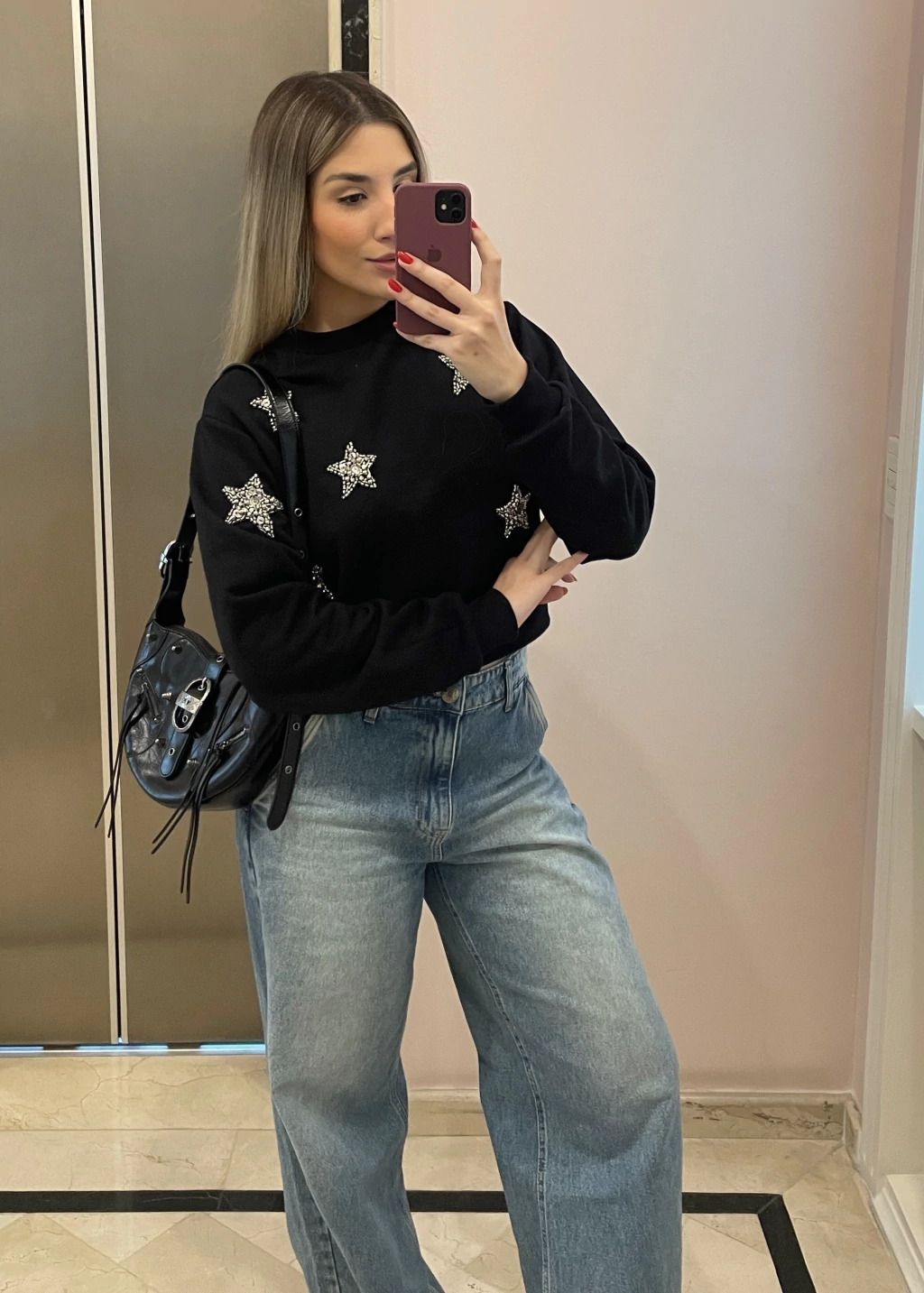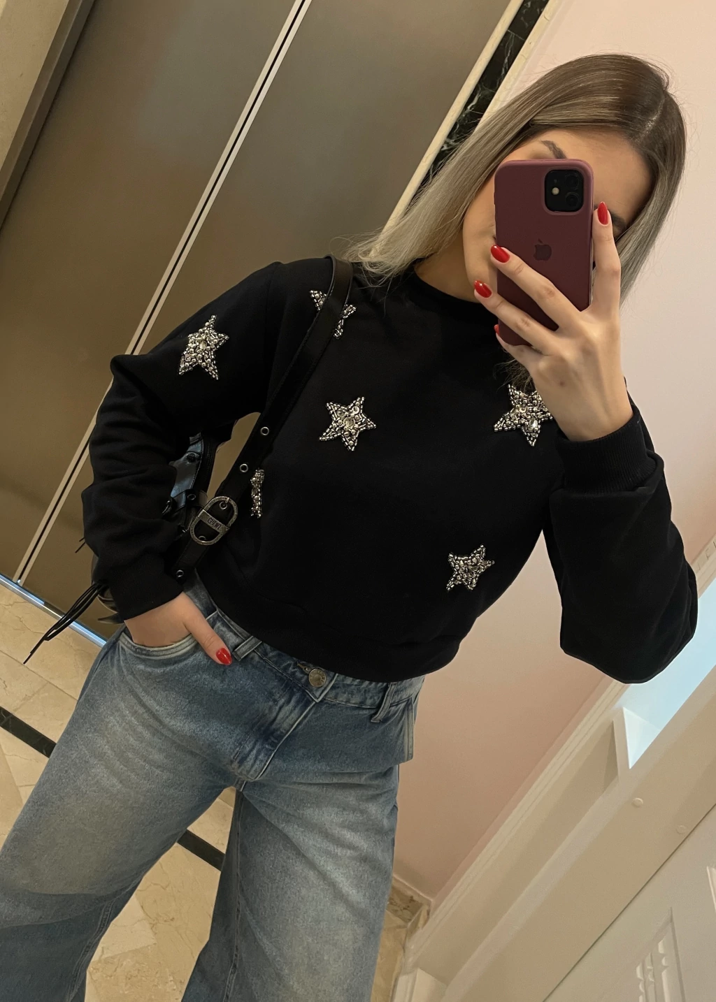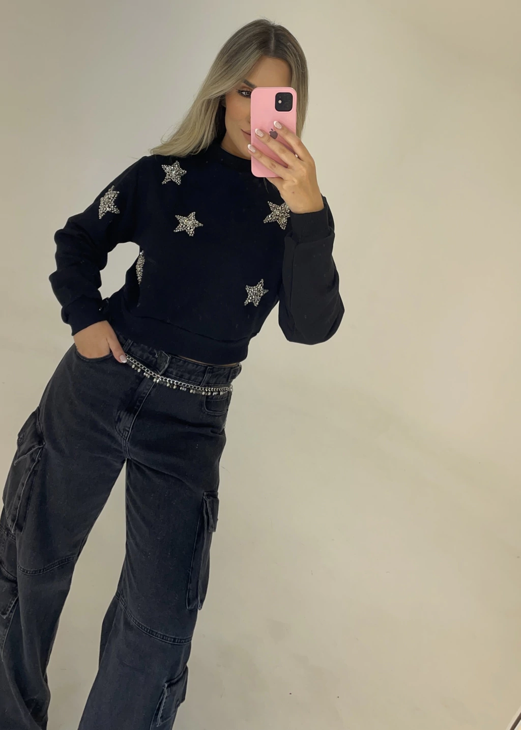 Peça com desenhos de estrelas, bordadas à mão com mix de pedrarias em prata.