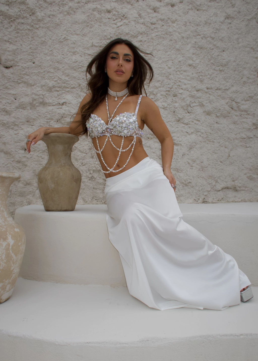Confeccionada em cetim toque de seda. Fechamento por zíper nas costas. A saia é forrada na altura do bumbum, por conta disso a transparência é extremamente sutil, mas sugerimos usar a saia com uma calcinha do seu tom de pele.