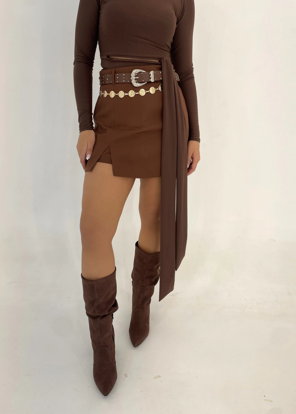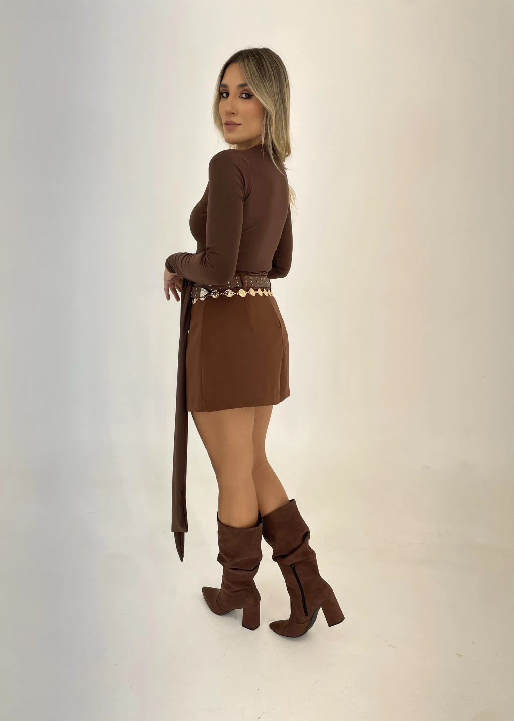 Shorts saia de alfaiataria com saia na parte da frente e das costas.