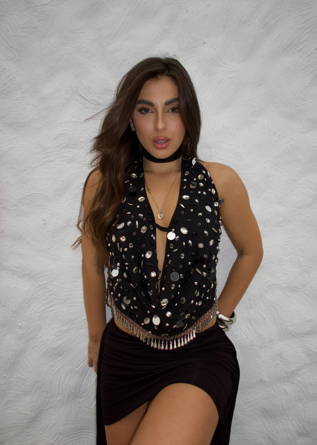 Bordado à mão com mix de pedrarias e paetês em tons de prata, preto e fumê. Barra com franjas aplicadas.