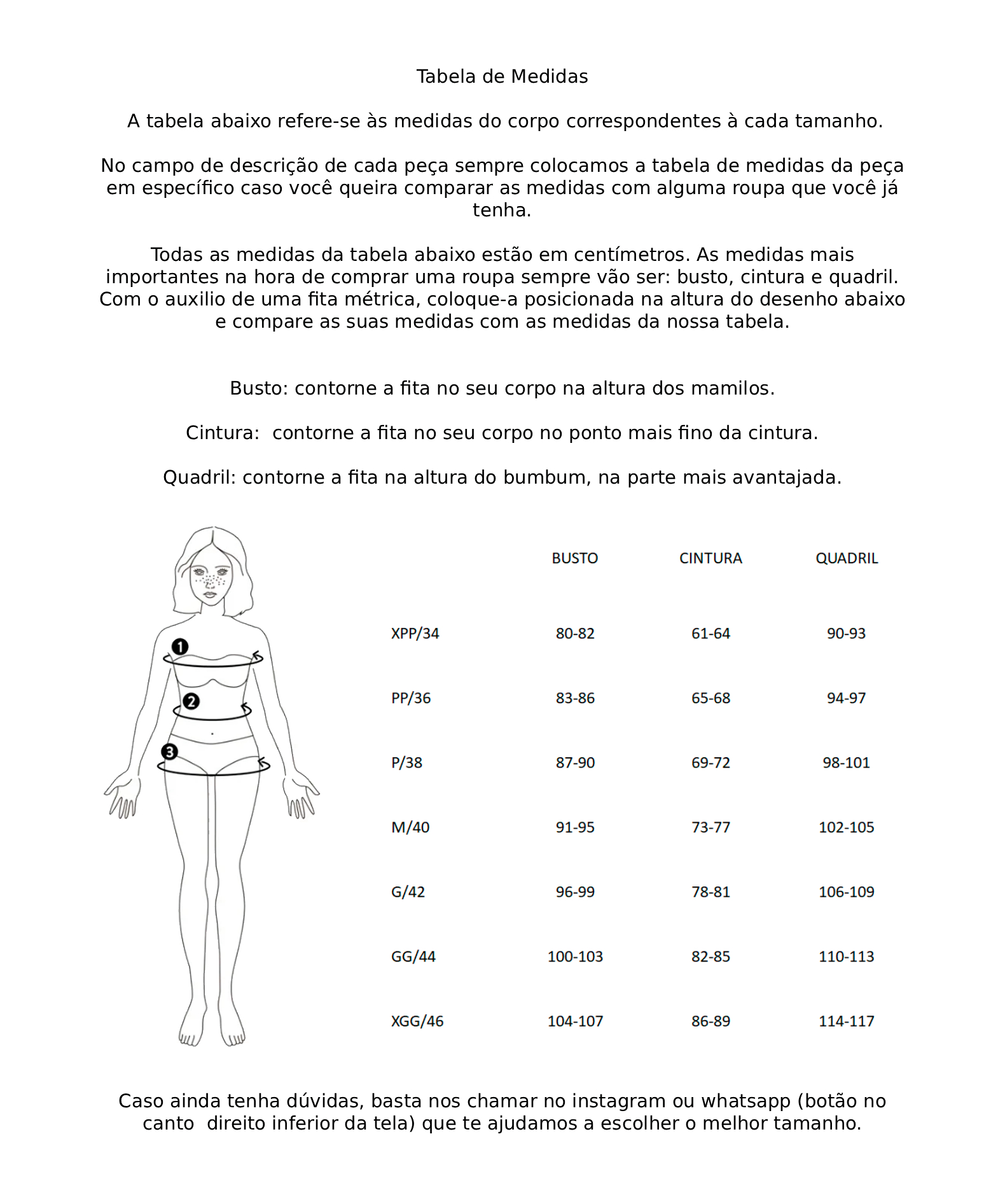Medidas da modelo da foto: busto 93cm / cintura 74cm / quadril 103cm / altura 1,70 (manequim M/40).