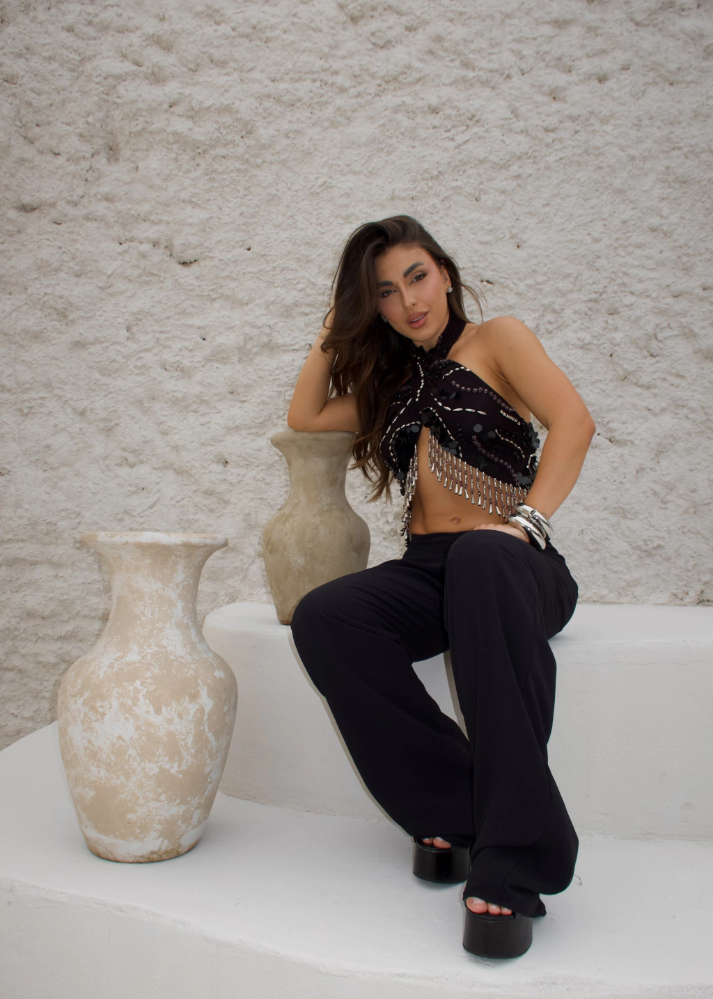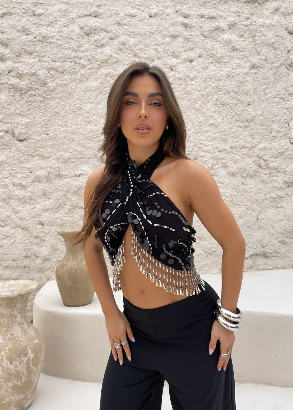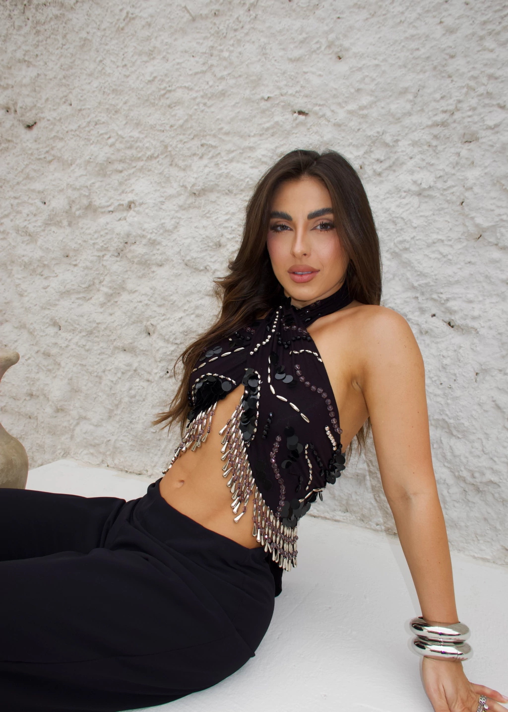 Bordado à mão com mix de pedrarias e paetês em tons de prata, preto e fumê. Barra com franjas aplicadas.