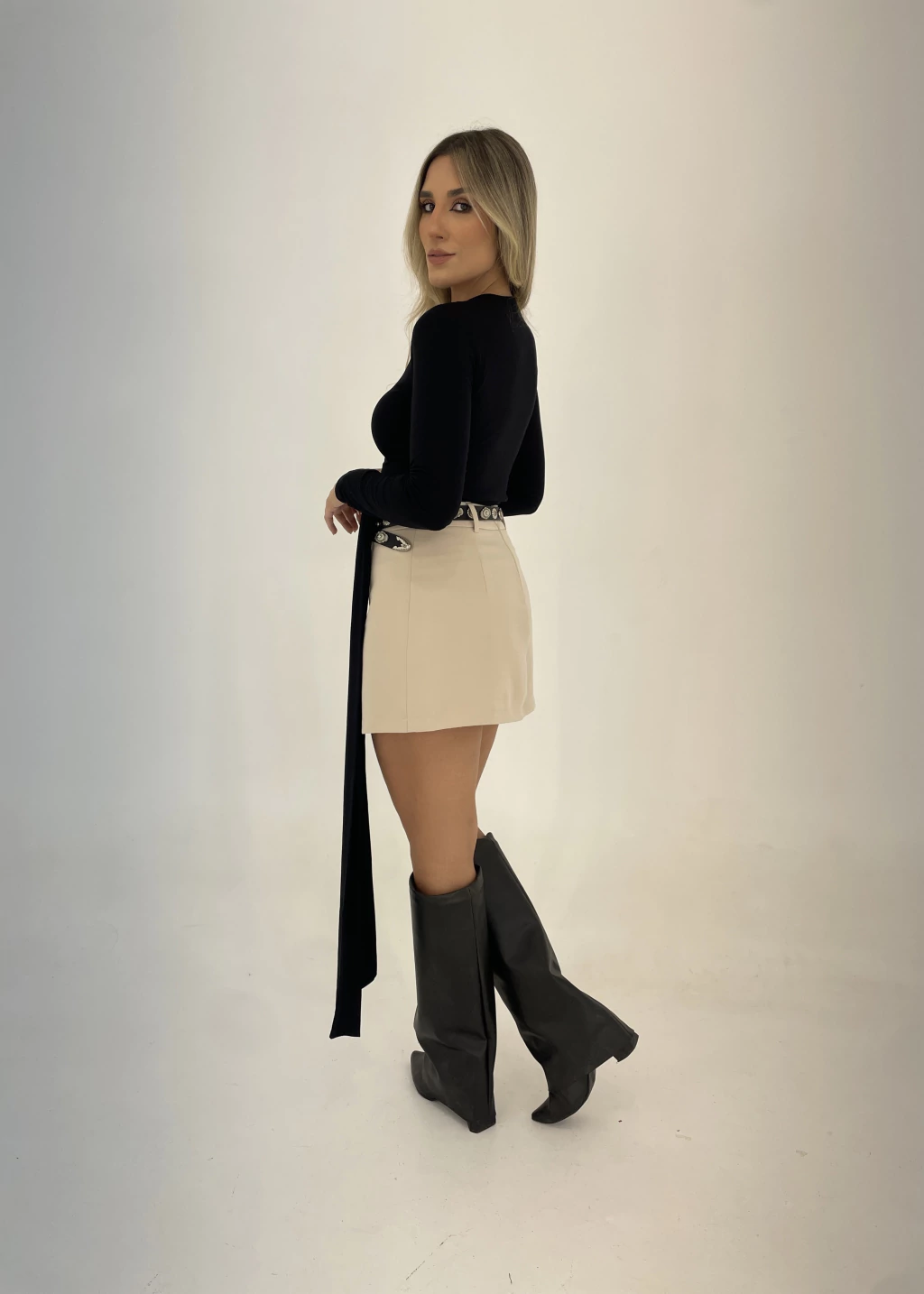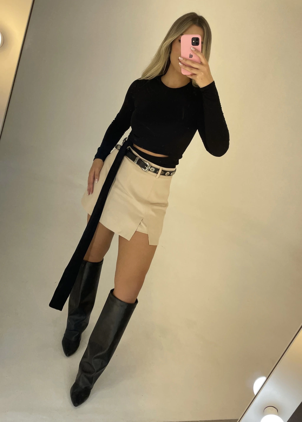 Top cropped de manga longa com faixa para amarração lateral. Possui modelagem ajustada ao corpo e é confeccionado em malha super macia de viscose (92% viscose 8% elastano).
