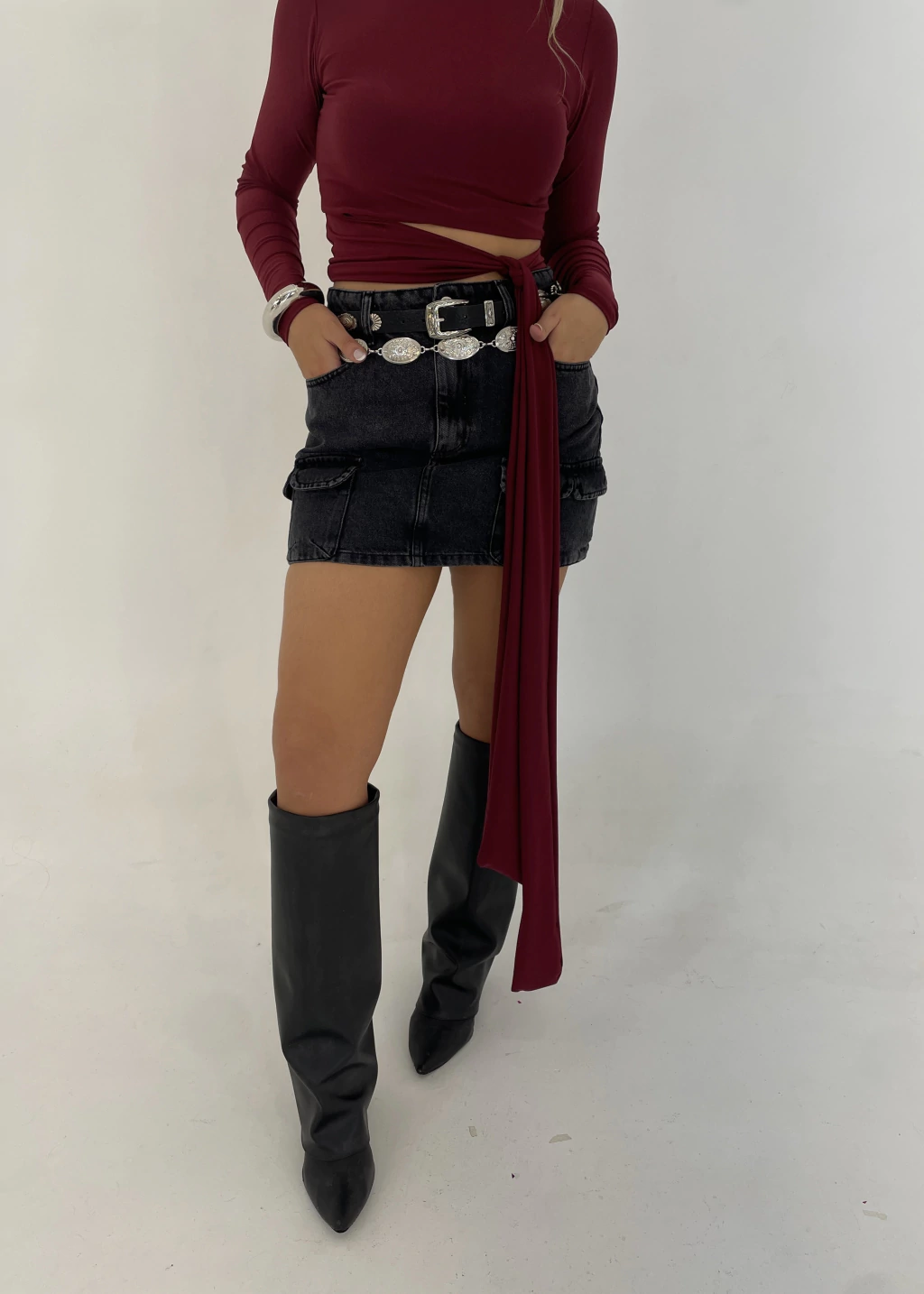 Top cropped de manga longa com faixa para amarração lateral. Possui modelagem ajustada ao corpo e é confeccionado em malha macia (92% poliéster 8% elastano).