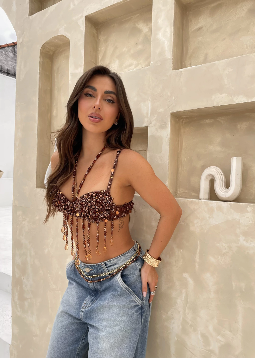 Peça bordada manualmente com mix de pedrarias, miçangas, paetês e cristais em tons de marrom.