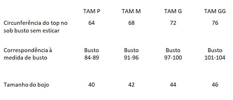 Observação: As medidas acima correspondem à peça aberta (medindo a parte da frente e a parte das costas juntas com a fita métrica) sem esticar. Recomendamos comprar pelo seu tamanho habitual de sutiã com bojo! O top possui tule nas laterais e estica ao vestir, adequando-se ao corpo na parte das costas, então recomendamos usar como base o seu tamanho de sutiã com bojo para que sustente corretamente o seio.