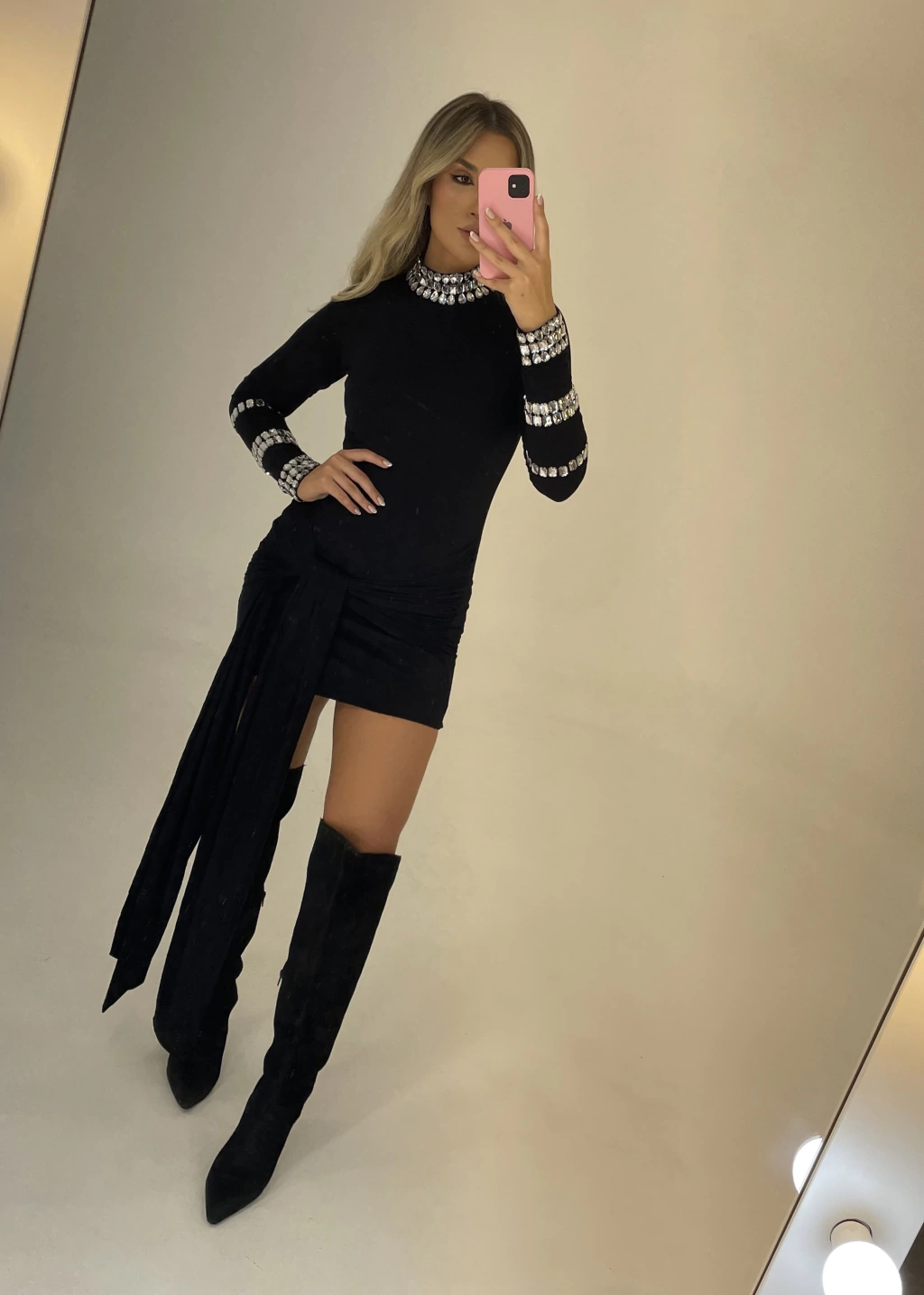 Vestido de manga longa, comprimento curto, gola alta e faixas laterais para usar com a amarração ou sem. Possui modelagem ajustada ao corpo e é confeccionado em malha super macia de viscose (92% viscose 8% elastano) na cor preto. O tecido tem elasticidade e estica ao vestir. Não tem transparência, é duplo na parte do corpo (frente e costas).